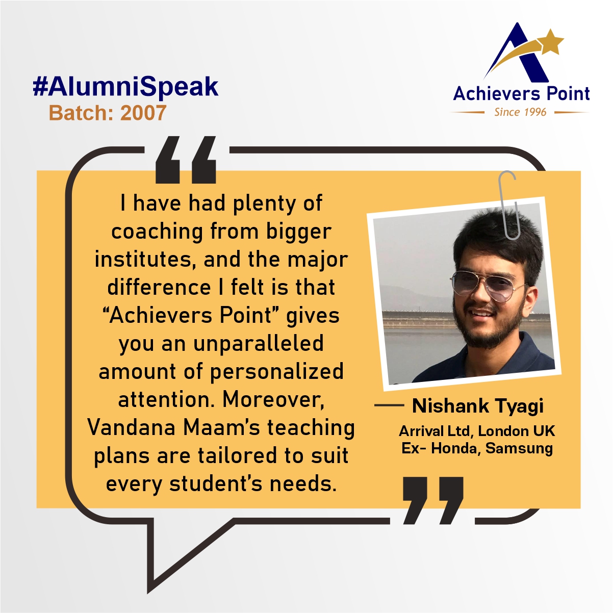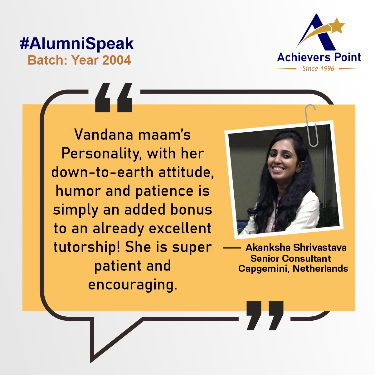 "Vandana Ma’am is truly an inspiration! She patiently clears all doubts and ensures that every student gets personal attention. The small batch size at Achievers Point allows us to interact freely and learn better."